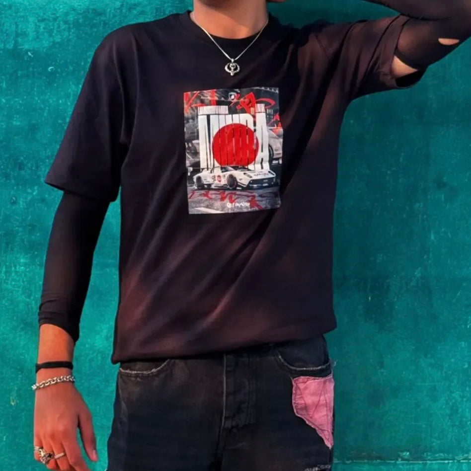 Celebrate an icon of automotive history with the Lamborghini Miura Tribute Graphic Tee. This sleek black t-shirt features a bold Japanese-inspired design, combining the legendary Miura silhouette with a vivid red sun backdrop for a perfect fusion of motorsport heritage and streetwear edge. Crafted from premium soft cotton, it offers a comfortable fit for everyday wear while making a statement for car enthusiasts and style-conscious individuals alike.